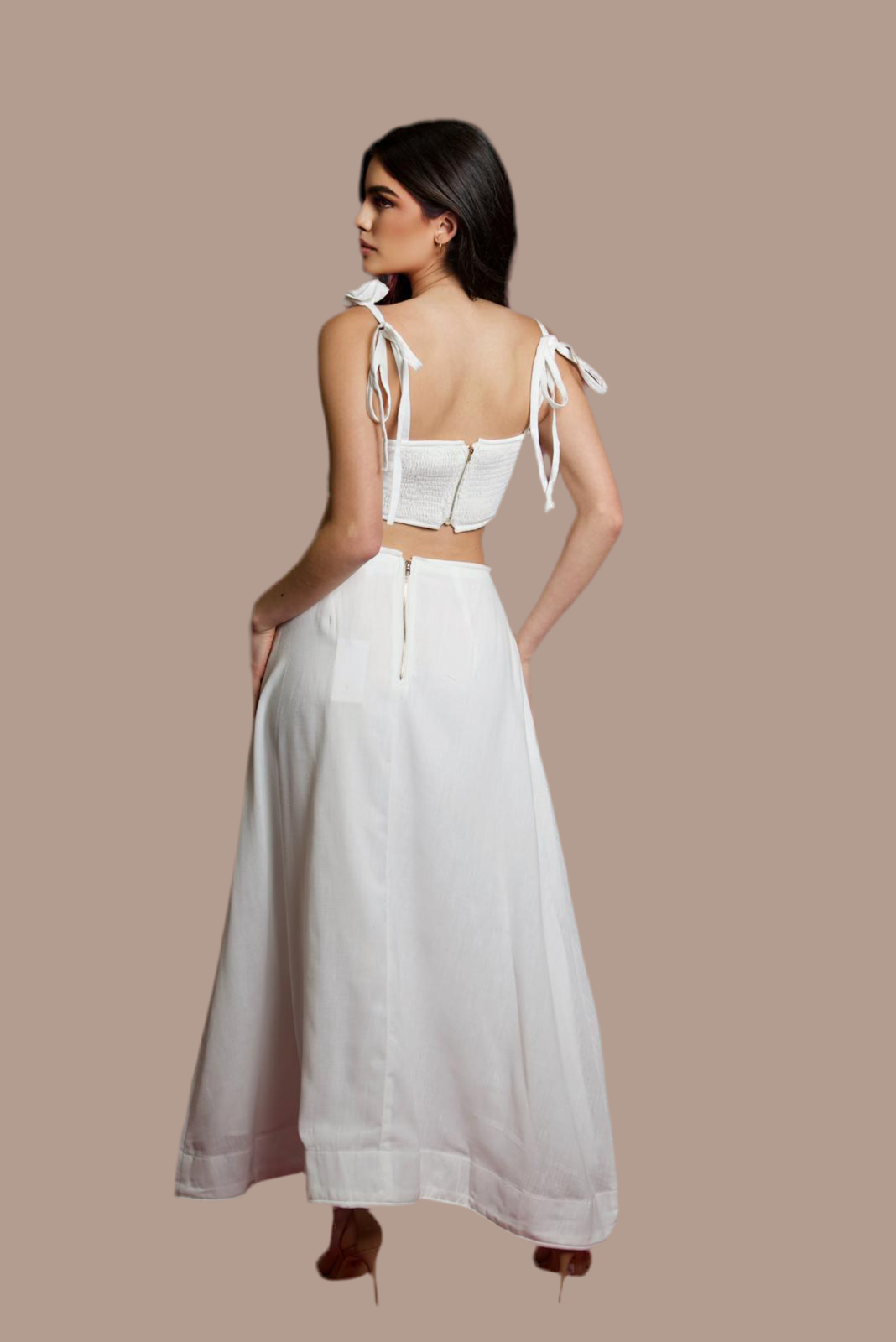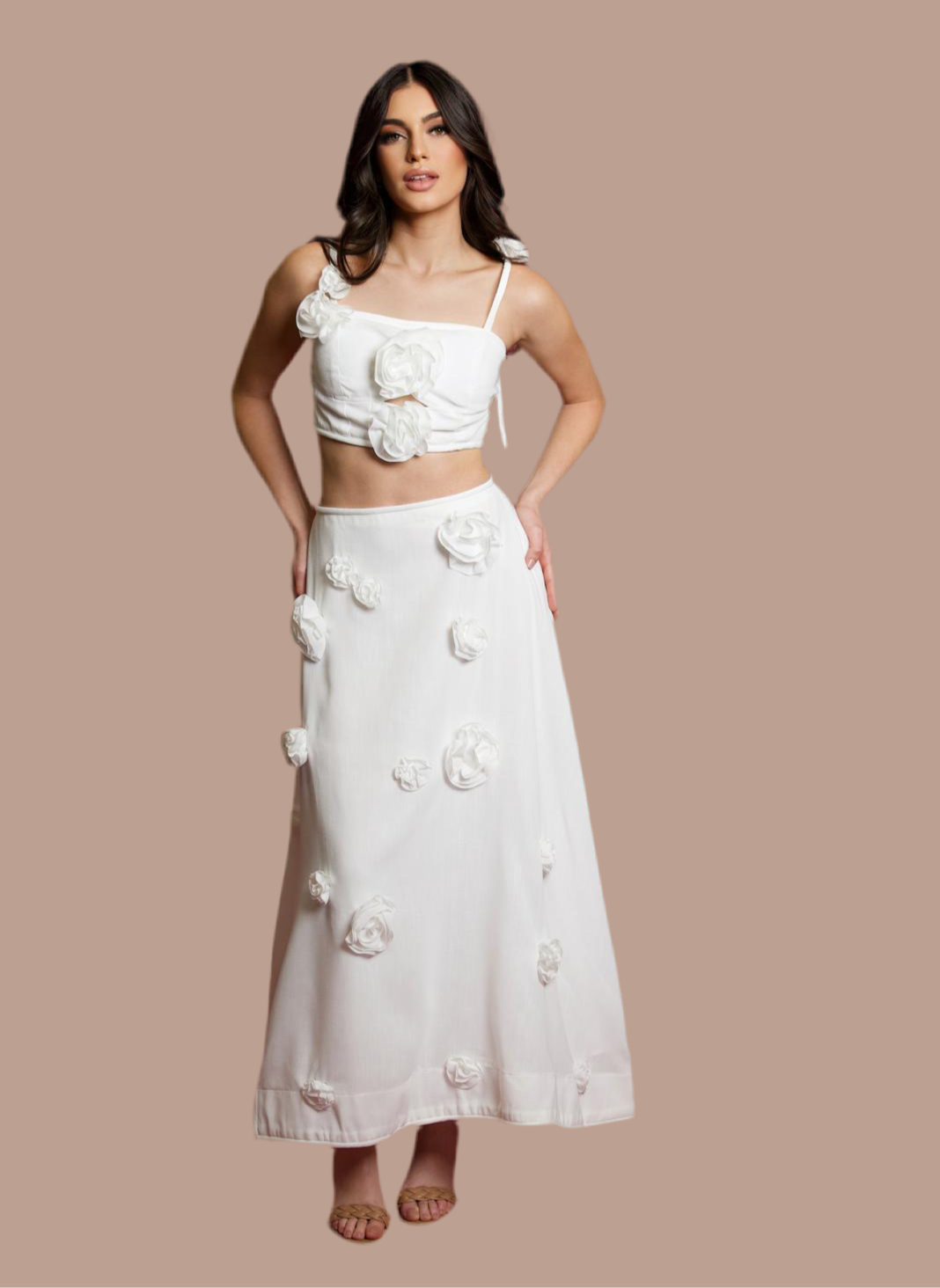 The model is wearing a size S, which fits her measurements: bust 32", waist 24". She is 5'8" tall.