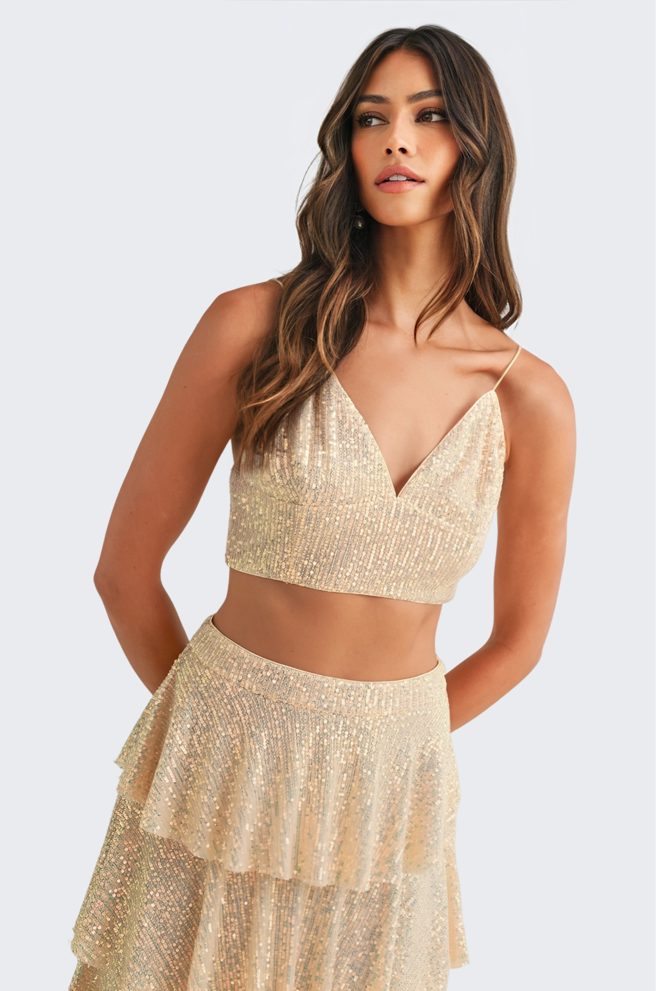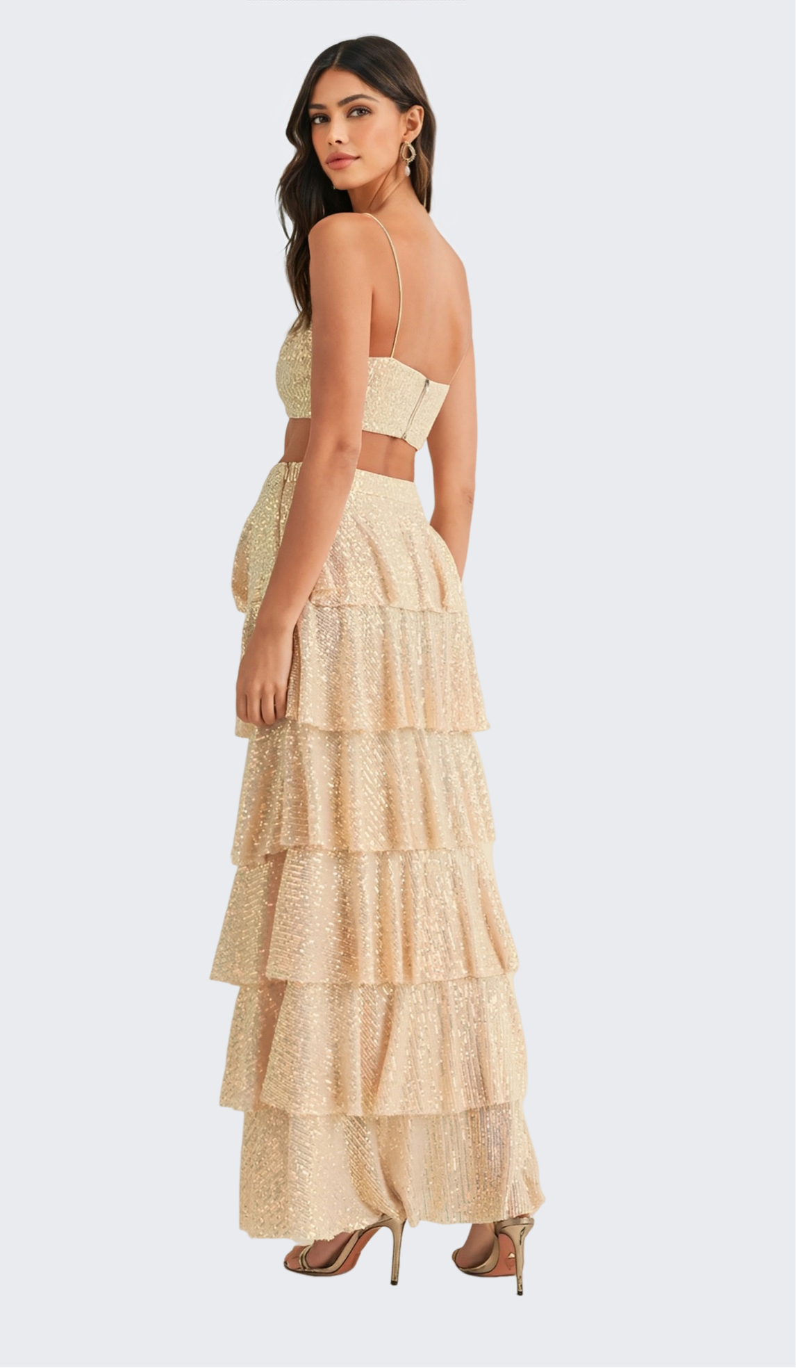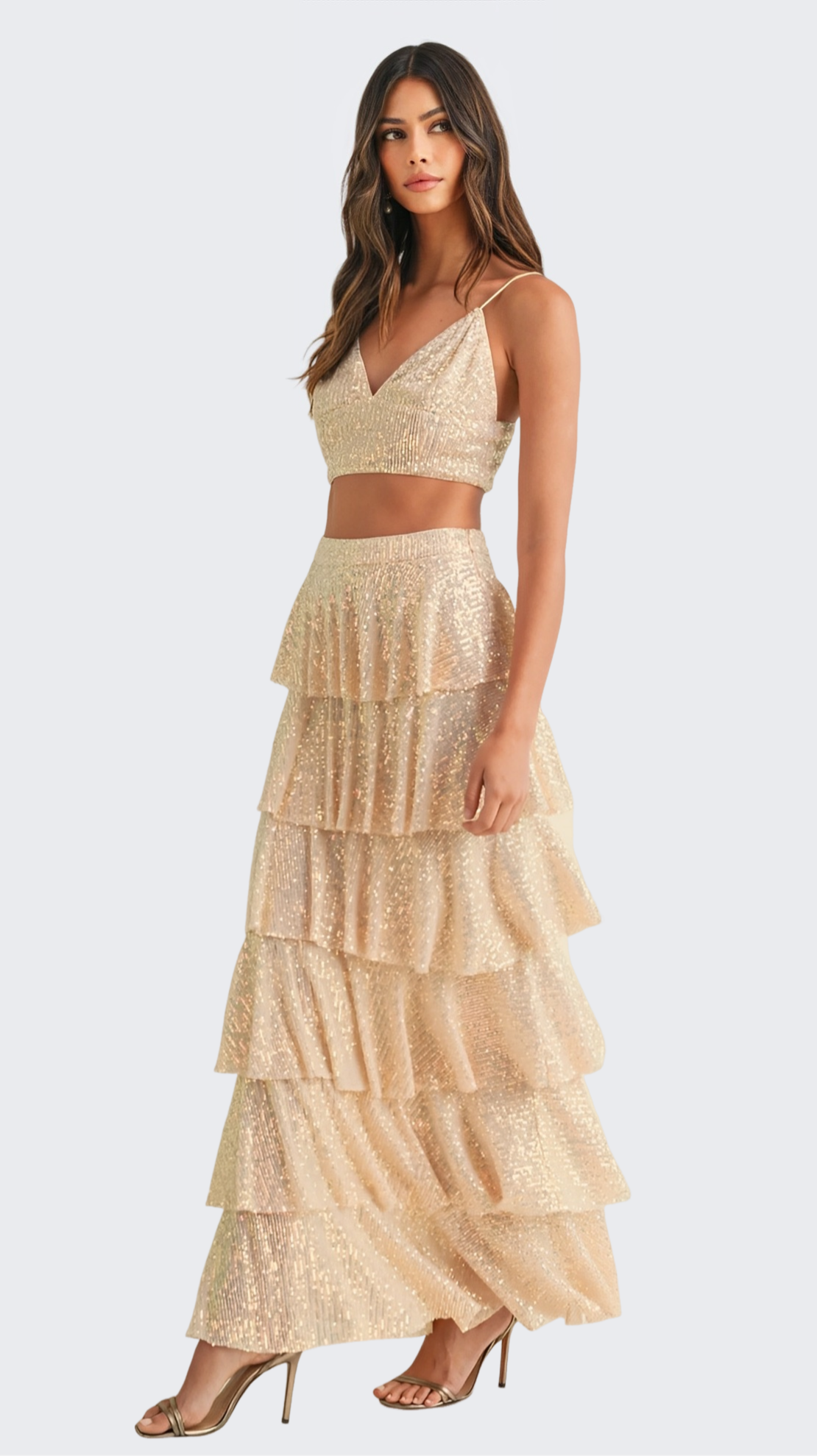 Gold Sequin 2-Piece Set with Tiered Maxi Skirt