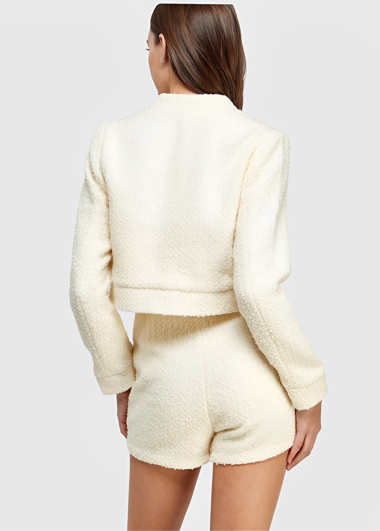 This elegant 3-piece set includes a structured crop top with black vertical piping, high-waisted shorts, and a cropped military-style jacket with decorative black buttons. Made from a soft, textured tweed fabric in a refined ivory tone, this set is perfect for a chic daytime look or to stand out at a stylish event.