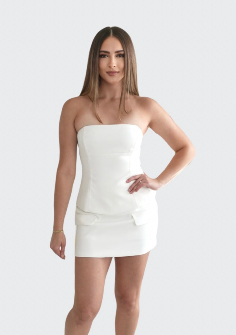Sleek, minimal, and irresistibly chic — the Ava Set is your new cocktail hour essential. This structured white mini set features a strapless top with a sculpted fit and a matching high-rise skirt that elongates the legs and defines your silhouette. Made with a flattering tight fit, it hugs your curves in all the right places while maintaining a clean, sophisticated look — perfect for rooftop soirées, garden cocktails, or sunset celebrations.