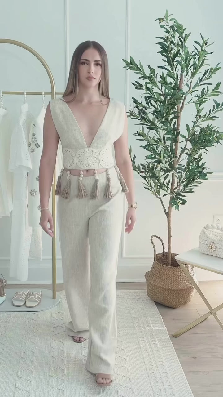 Make a stunning entrance in the Bernadette Set, a luxurious natural linen ensemble designed to captivate. This sleeveless V-neck crop top and high-waisted pant duo features handcrafted tassel detailing with gold accents that sway with every step — adding movement and charm. The soft linen fabric offers breathability and elegance, perfect for resort dinners, destination events, or summer soirées.
