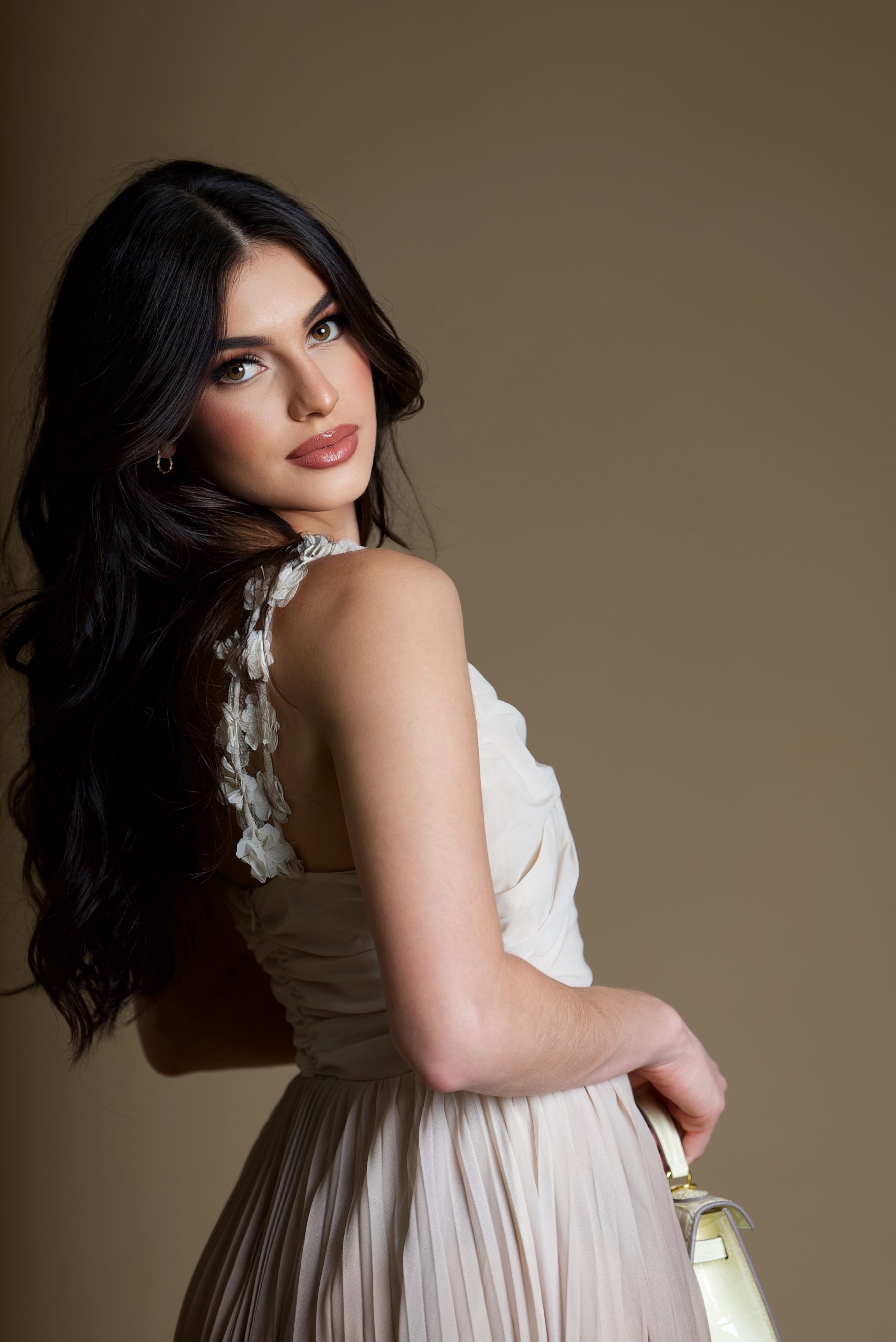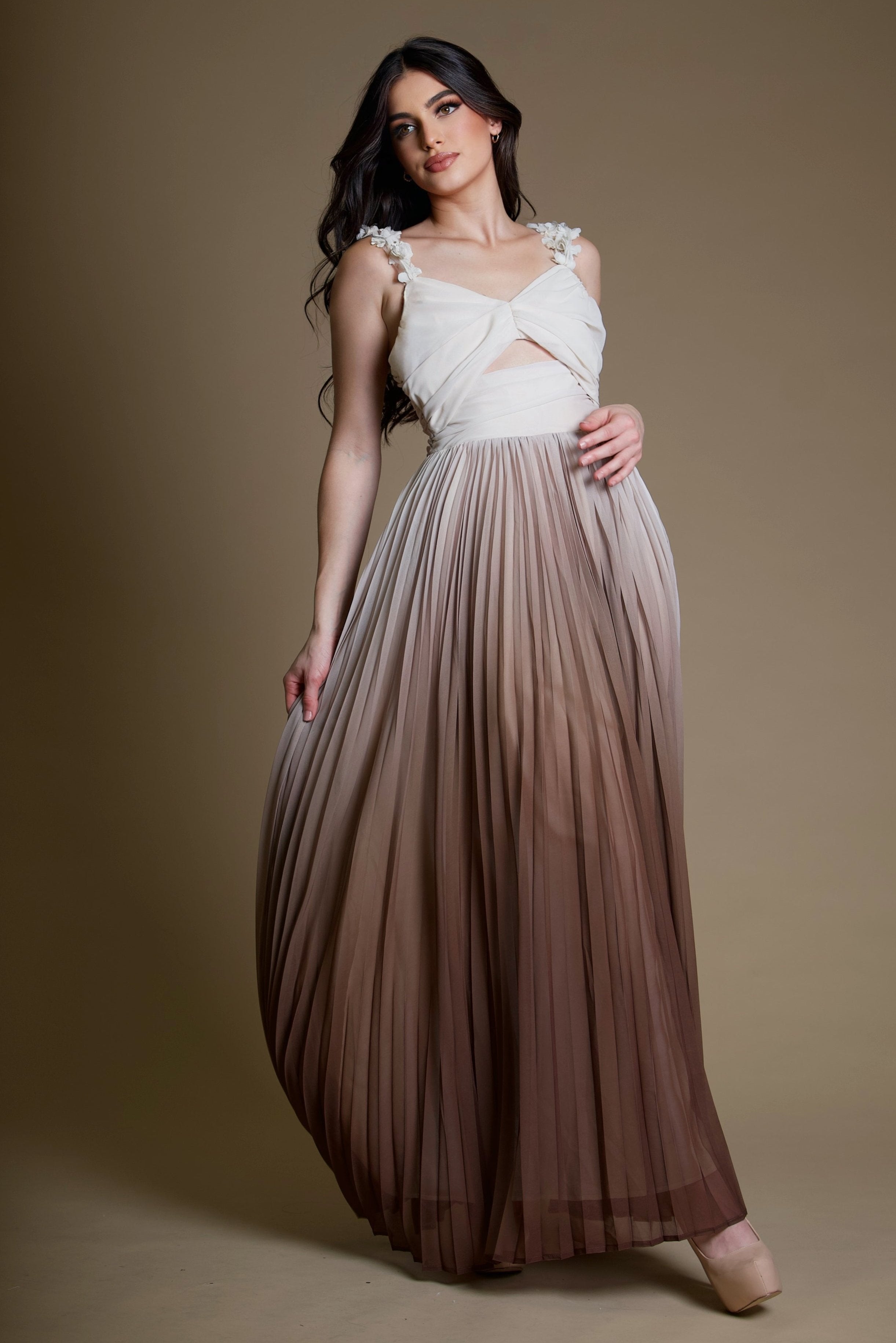 The model is wearing a size S, which fits her measurements: bust 32", waist 24". She is 5'8" tall.