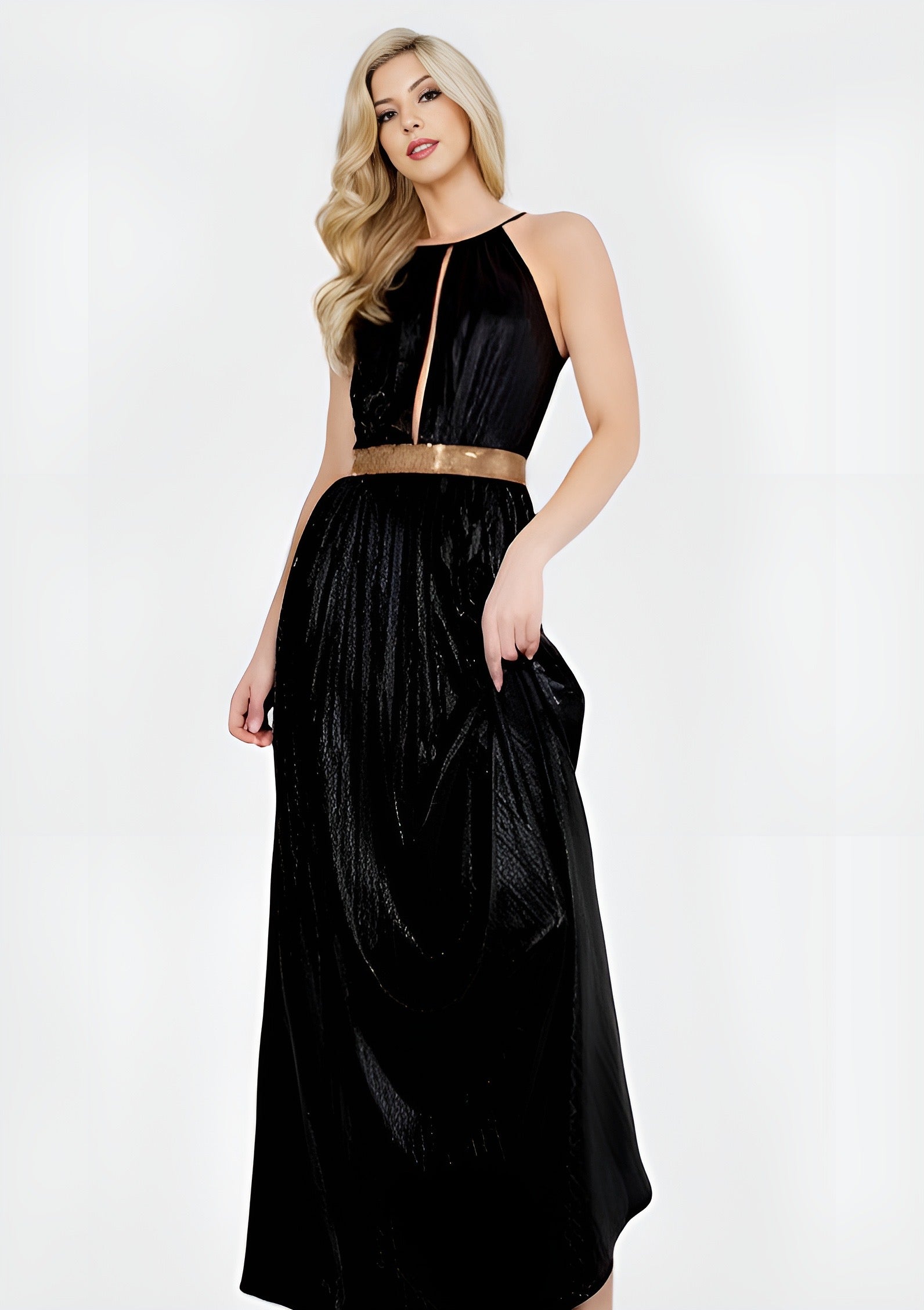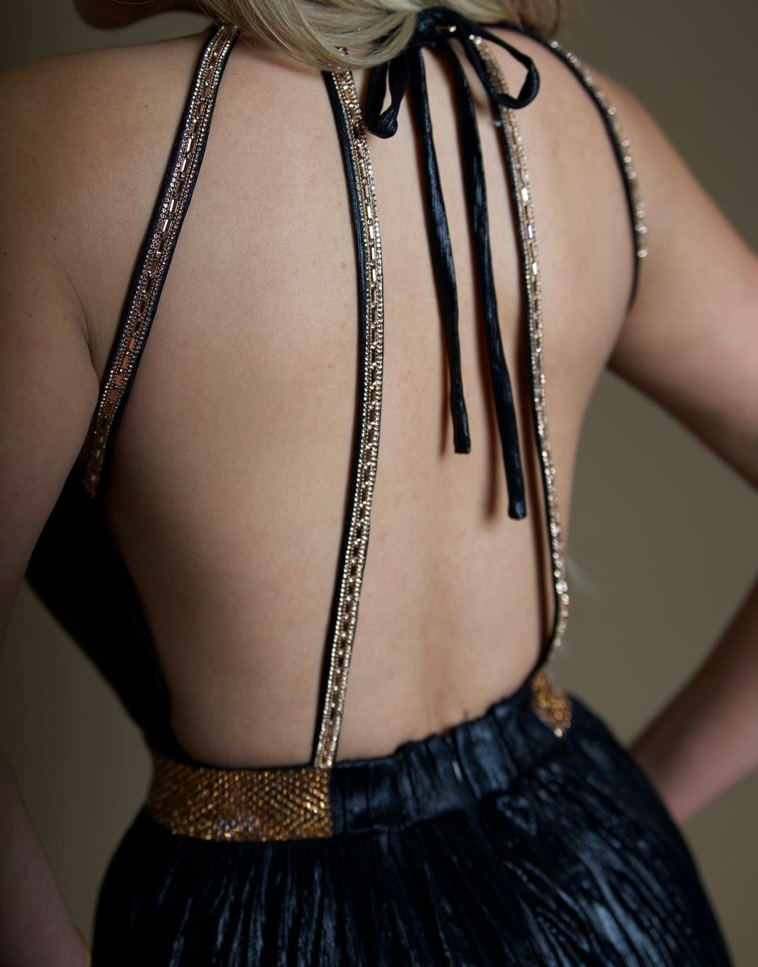 Black Metallic Gown with Gold Beaded Waist & Open Back
