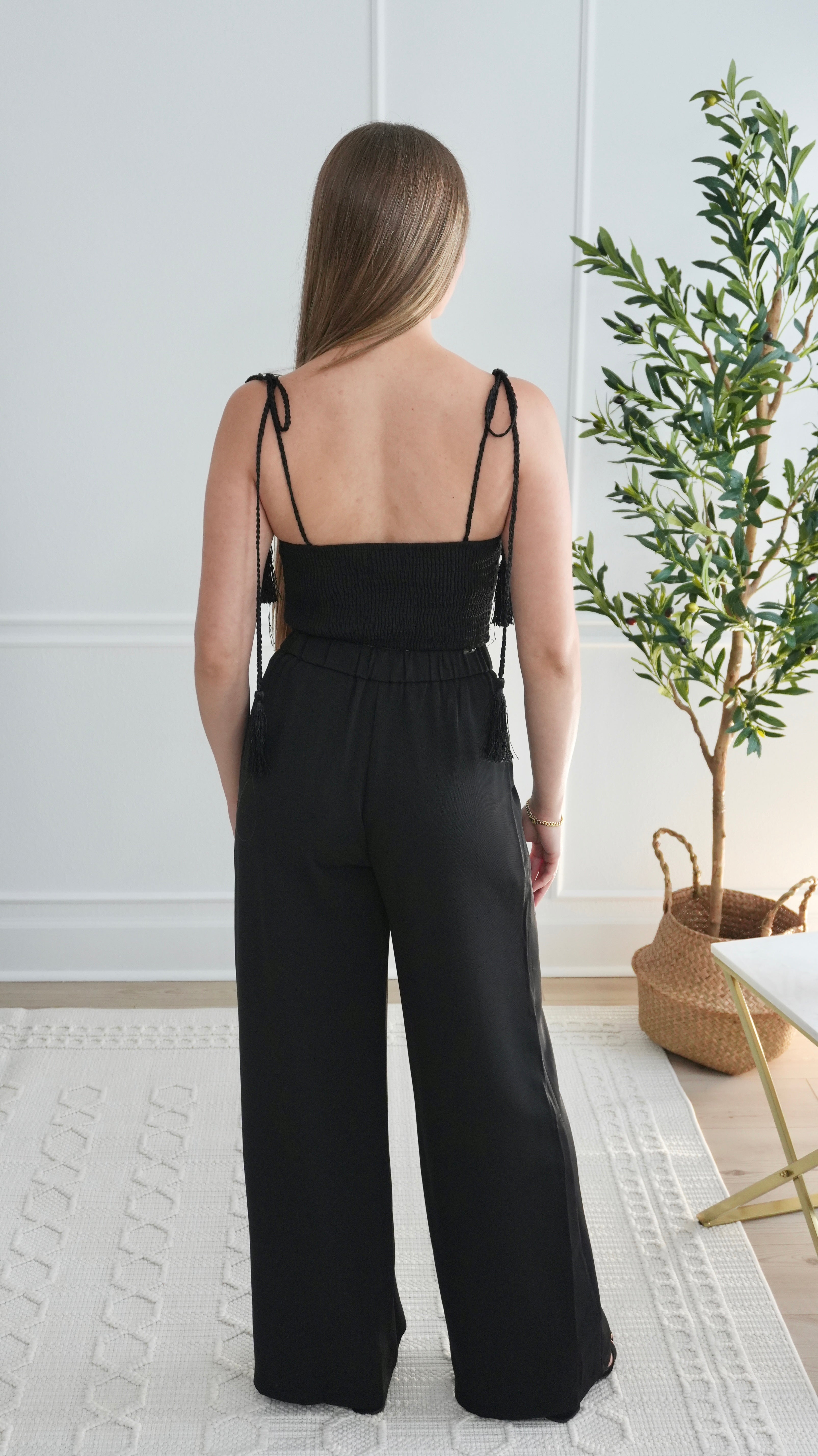 The Constance Pants Set is sleek and daring. The black top features adjustable tassel straps and a sheer lace lining covered in layered rope-like draping, creating a wrapped, feminine silhouette. The high-waisted, straight-leg pants flatter your figure and elongate your legs—perfect for nights out, chic dinners, or stylish events.