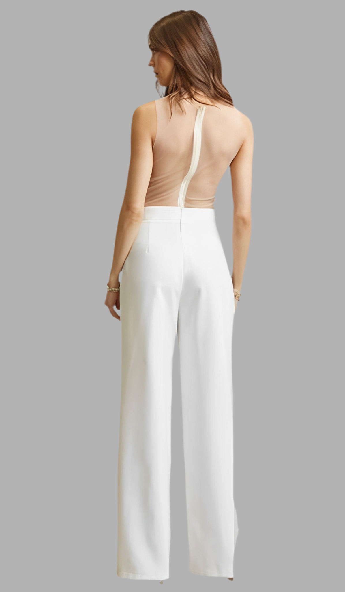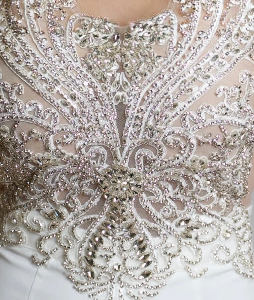 This show-stopping jumpsuit features an intricately embroidered mesh bodice adorned with shimmering rhinestones and pearls, creating a luxurious and elegant look. The illusion neckline and back zipper closure provide a flattering fit, while the high-waisted wide-leg trousers offer graceful movement and elongate the silhouette. A perfect choice for formal events, bridal celebrations, or sophisticated evening occasions.