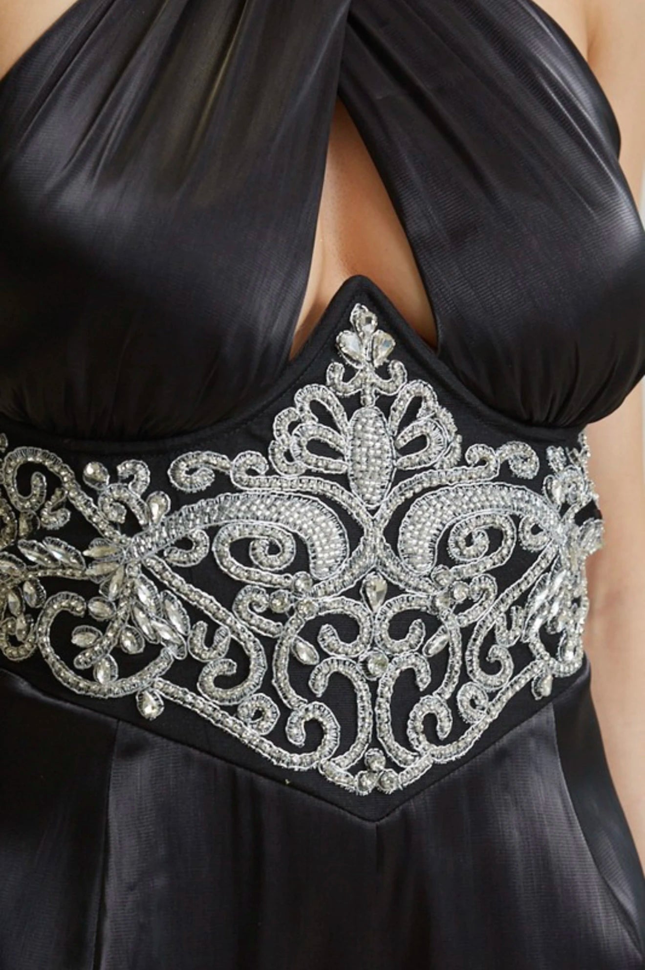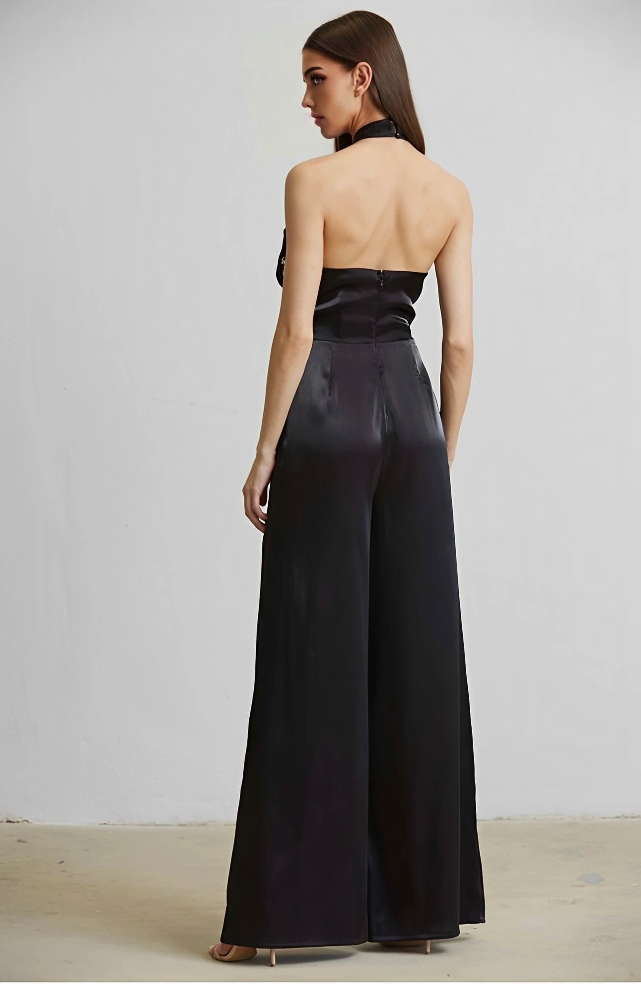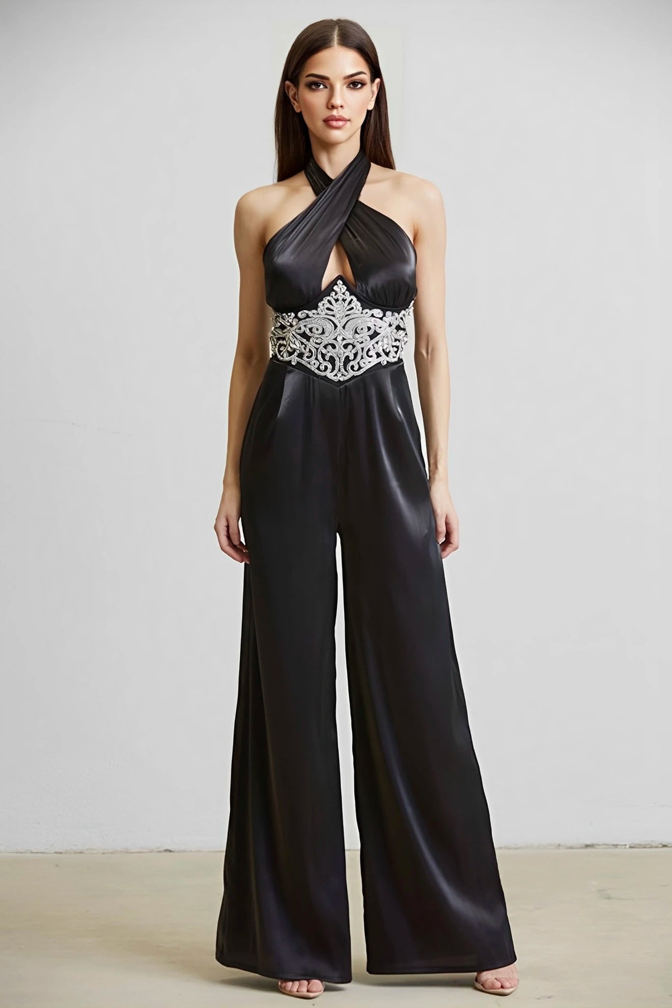 This sophisticated black jumpsuit features a stunning halter neckline with a crisscross front that beautifully enhances the neckline. The decorative waist detail cinches and defines the silhouette, creating a flattering, feminine shape. Wide-leg pants add a touch of elegance and fluid movement, making this piece perfect for formal events, evening outings, or special occasions. A timeless and statement-making look for any wardrobe.