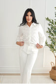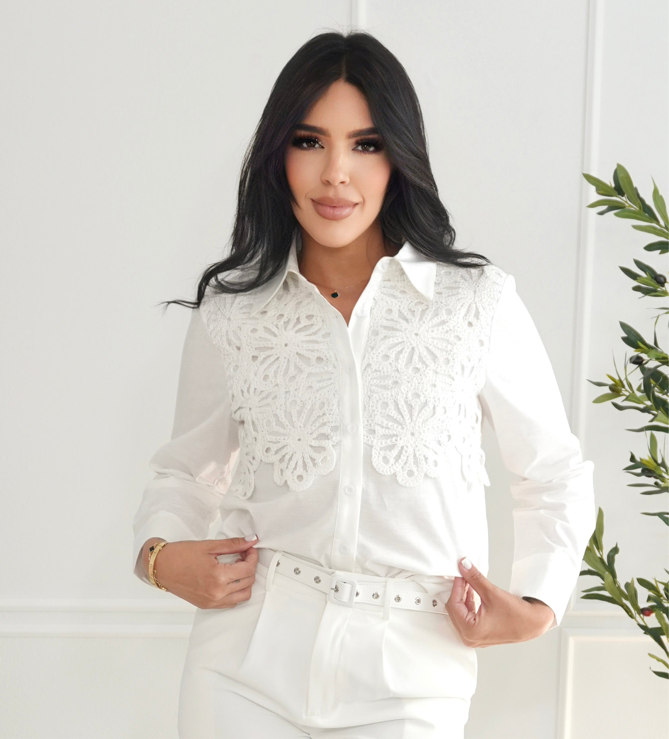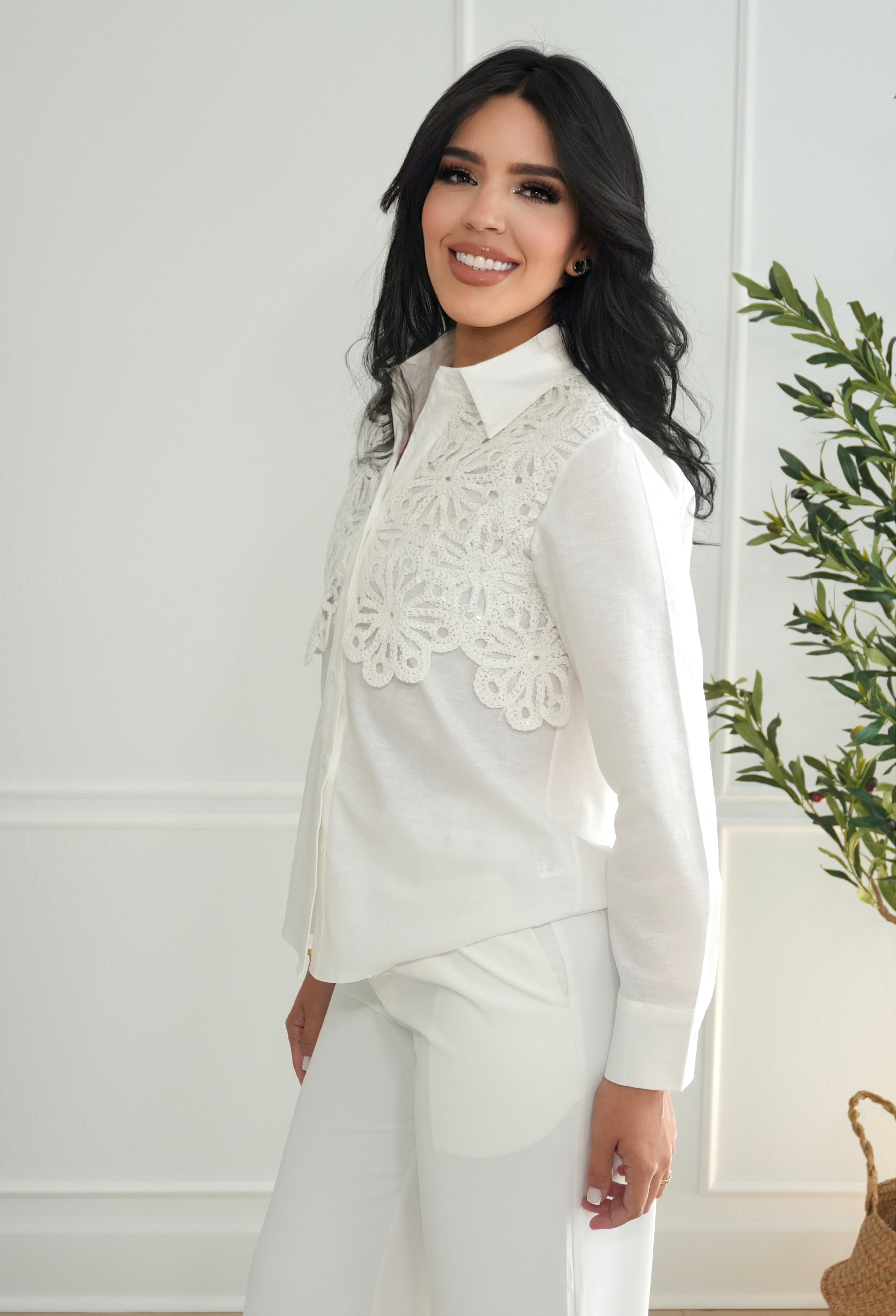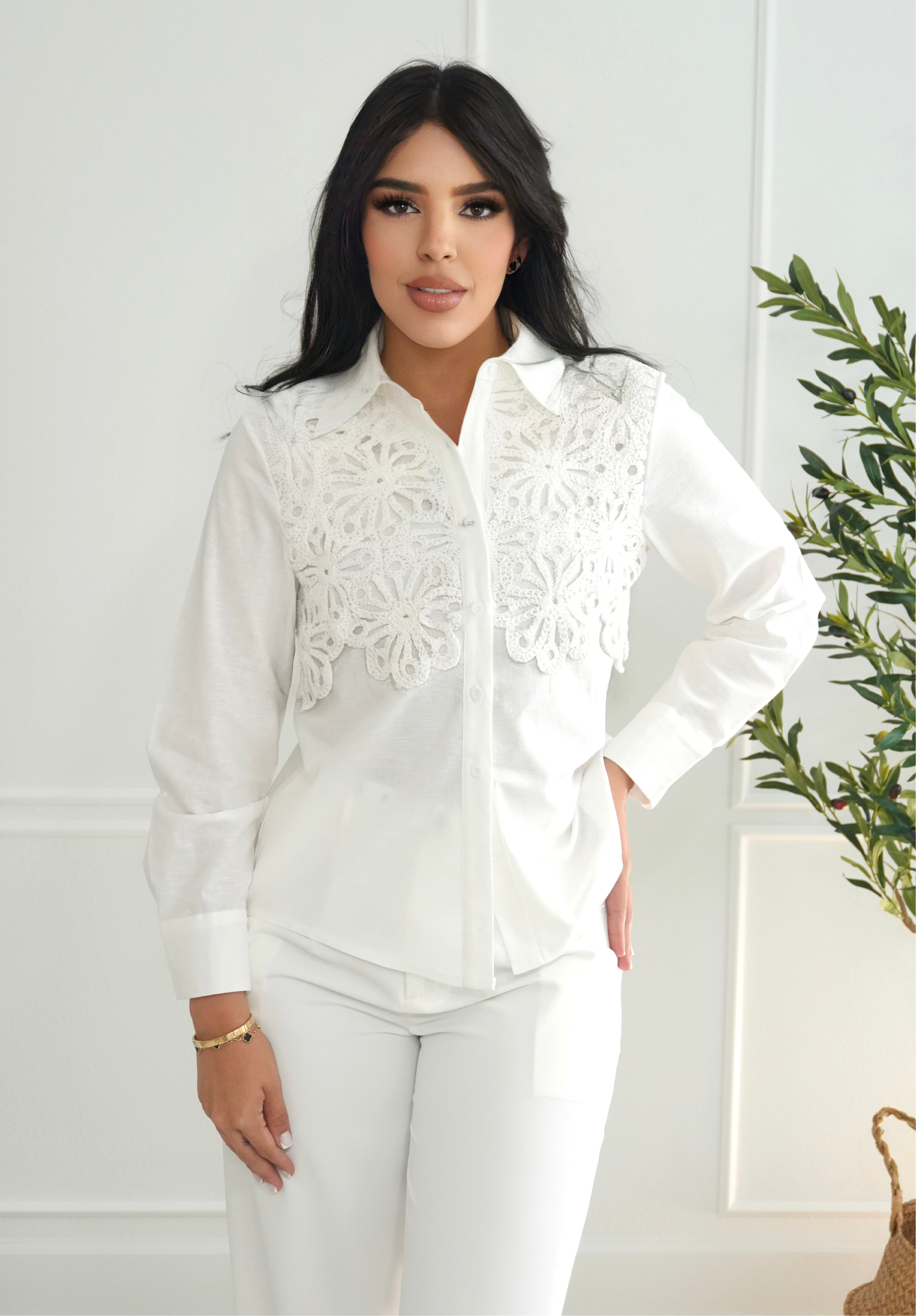 White shirt with crochet flowers