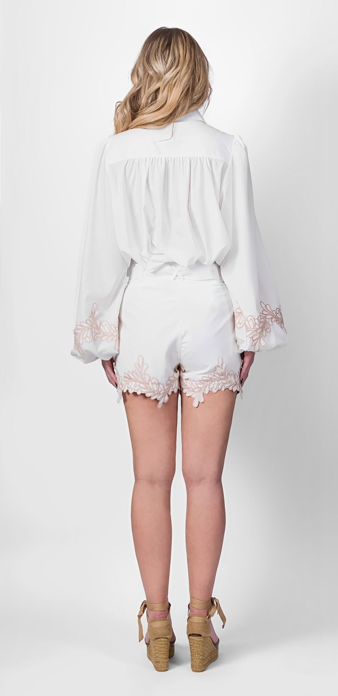 Feminine and effortlessly elegant, this two-piece set features a crisp white blouse with voluminous sleeves and delicate nude embroidery on the cuffs. The matching high-waisted shorts are finished with scalloped edges and coordinating embroidery for a polished, romantic look.