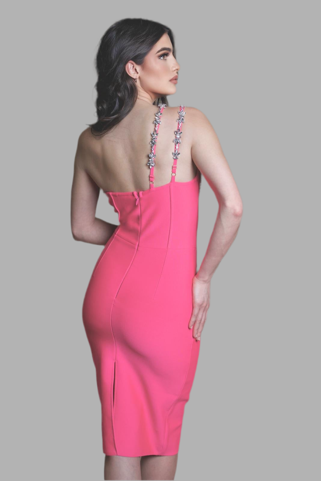 The model is wearing a size S, which fits her measurements: bust 32", waist 24". She is 5'8" tall.