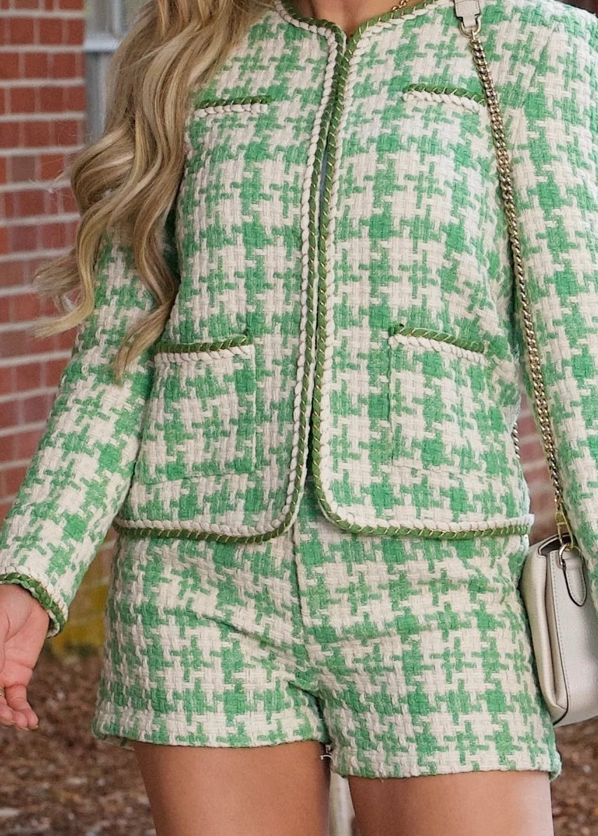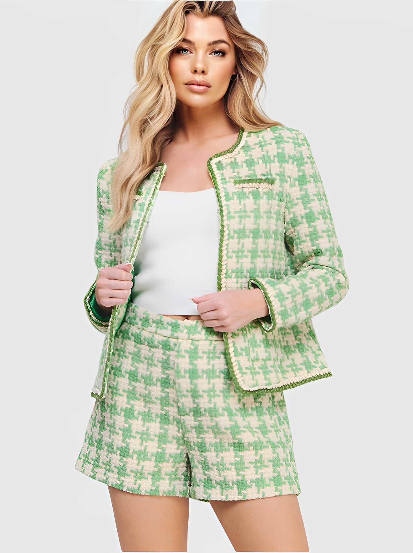 Step into timeless elegance with this 2-piece green tweed set featuring a tailored blazer and matching high-waisted shorts. The textured fabric showcases a soft green and cream houndstooth pattern, detailed with delicate fringe trim for a refined finish. Pair it with a white tank or blouse for a sophisticated day-to-night look.