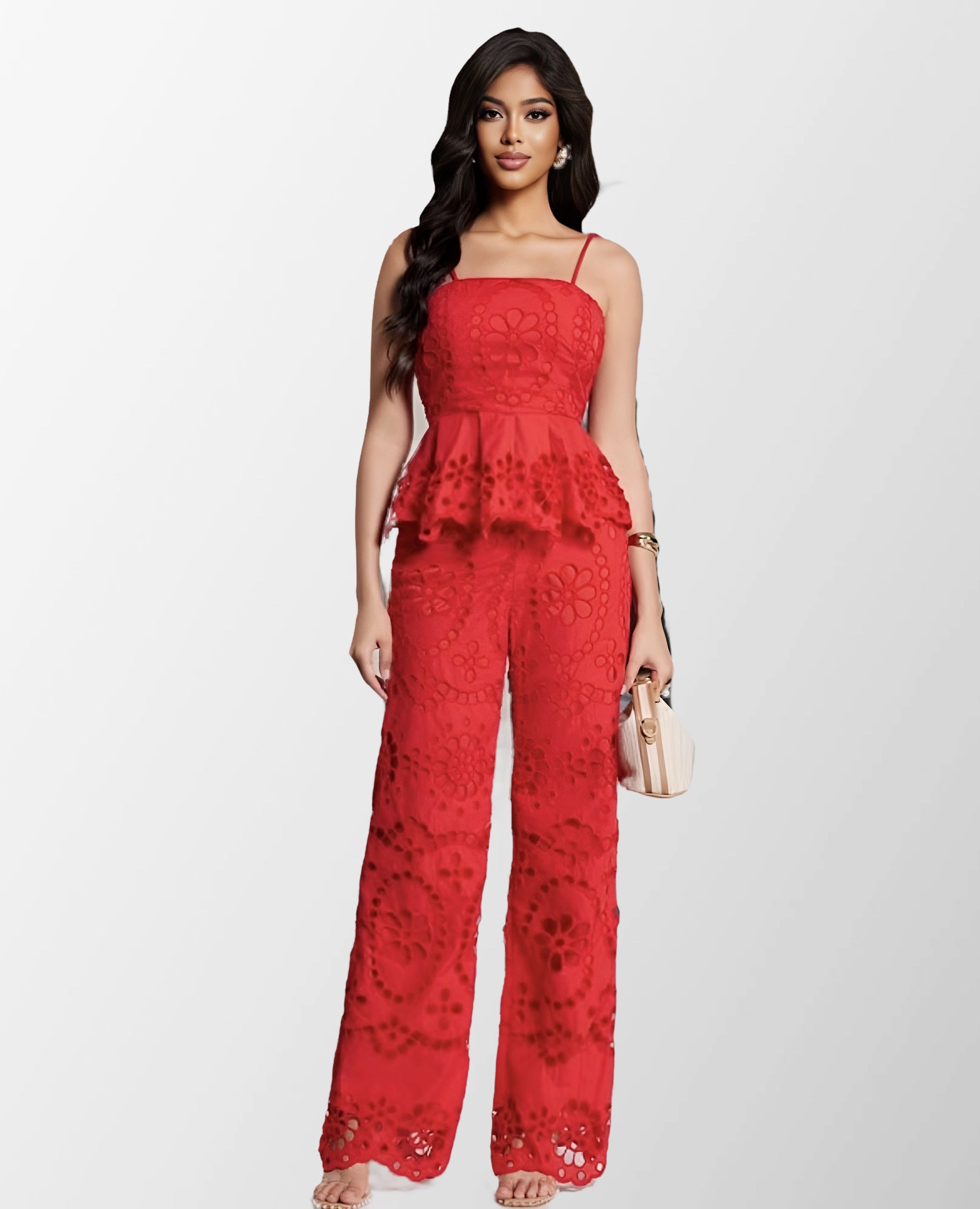 Chic and feminine, this red two-piece pant set features a floral eyelet design throughout. The top includes a flattering peplum waist and adjustable spaghetti straps, paired with matching high-waisted wide-leg pants for an effortlessly elegant look. Perfect for brunches, daytime events, or summer celebrations.