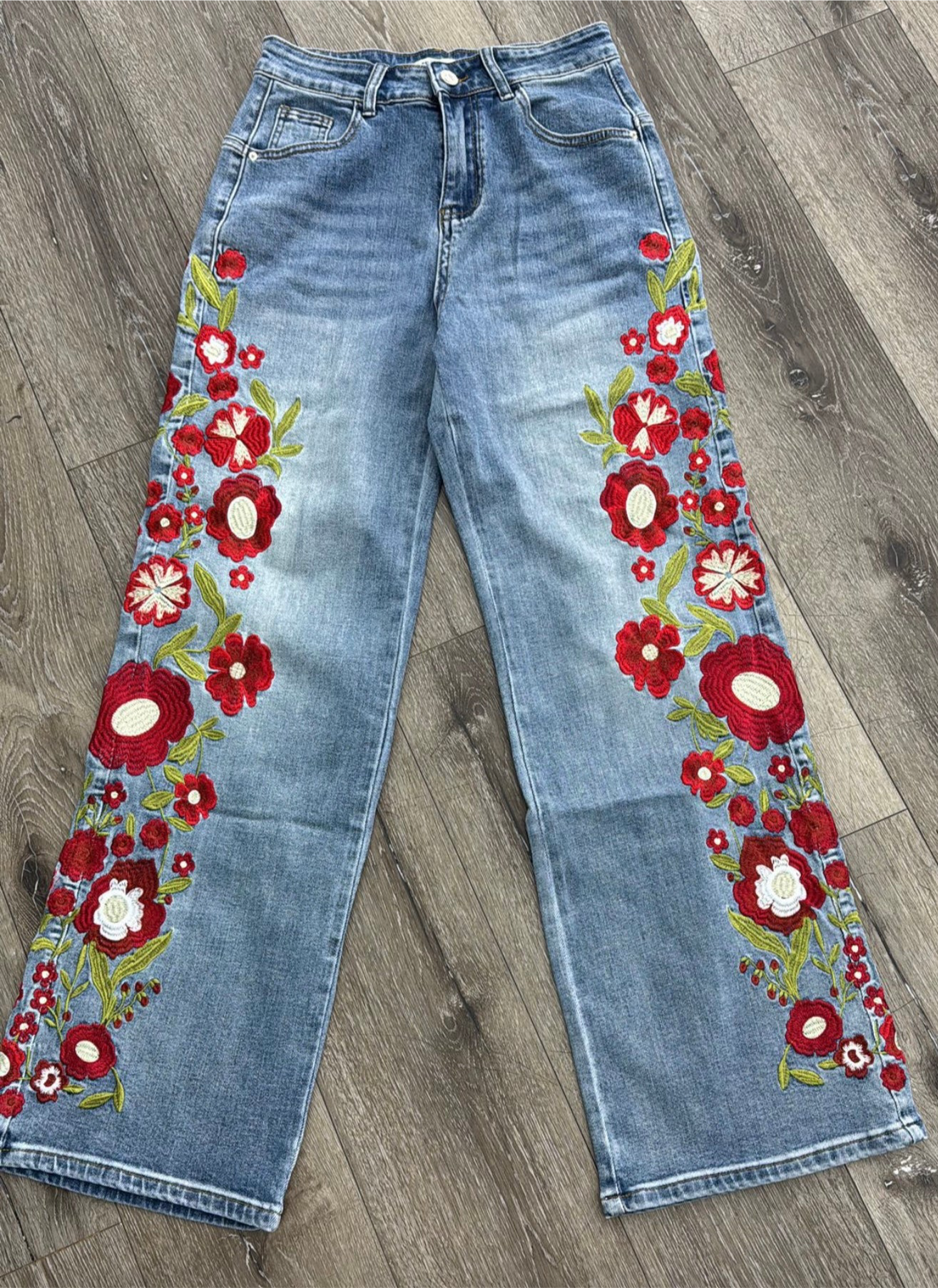 These high-waisted wide-leg jeans feature vibrant floral embroidery along both legs, adding a playful yet chic touch to your look. Designed in classic blue denim with a relaxed fit, they combine comfort and statement style, perfect for elevating your everyday outfits.