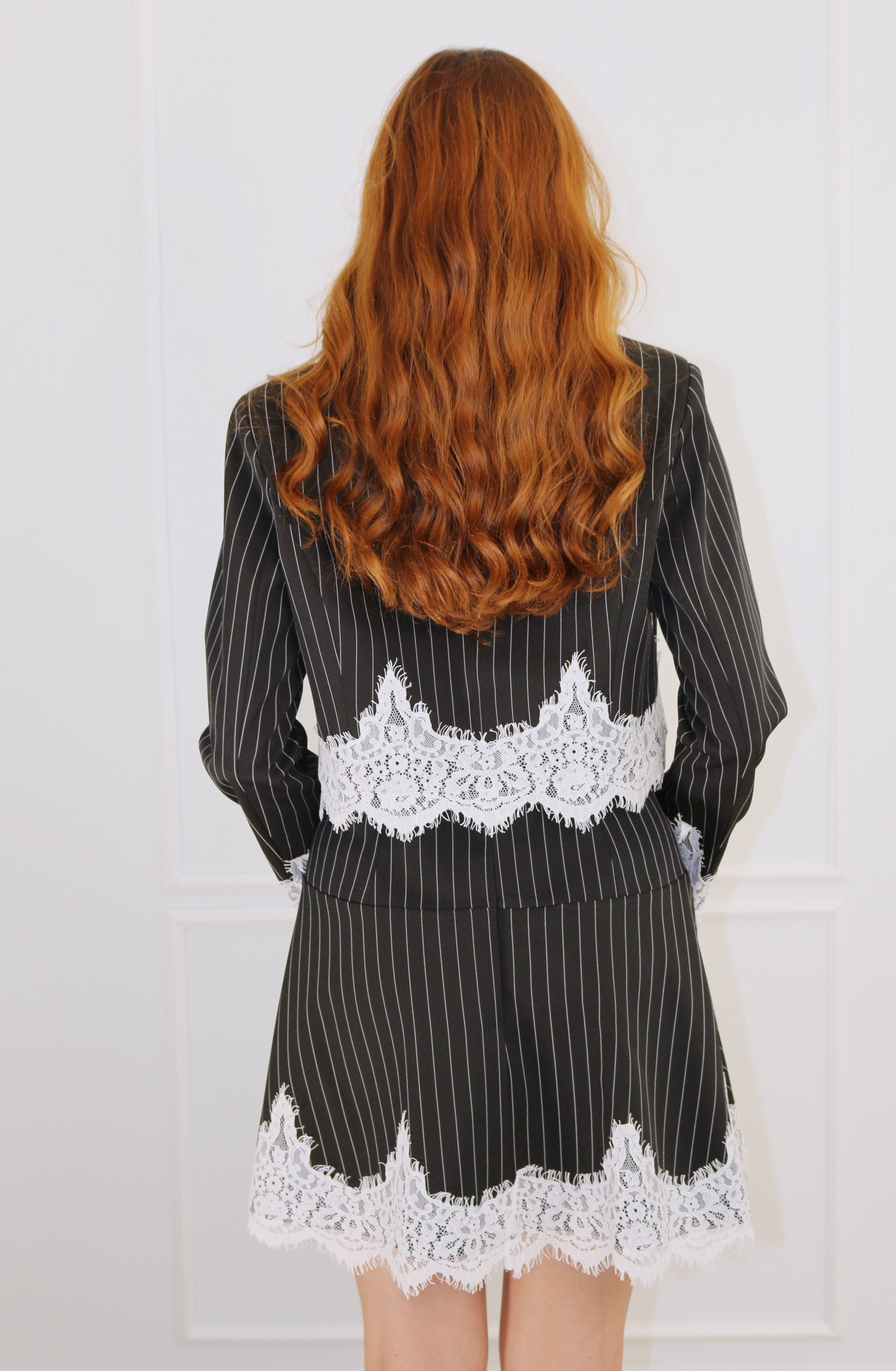 Lace trim pinsrtipeblazer dress set