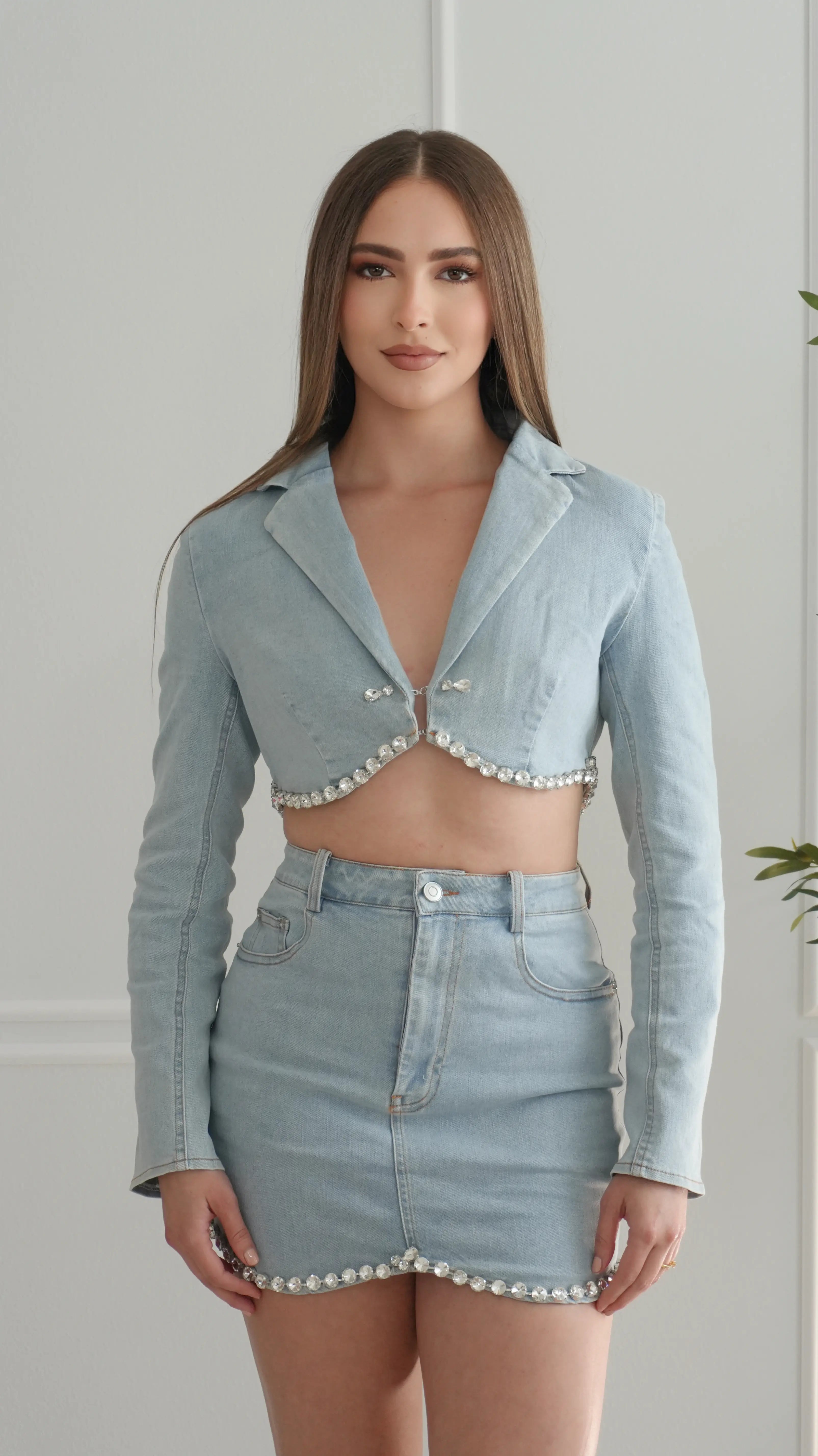 Featuring a cropped fitted jacket and matching high-waisted mini skirt, this edgy two-piece brings playful glam to your night-out wardrobe. The rhinestone detail adds a luxe twist to classic denim, making it a standout choice for any music event.