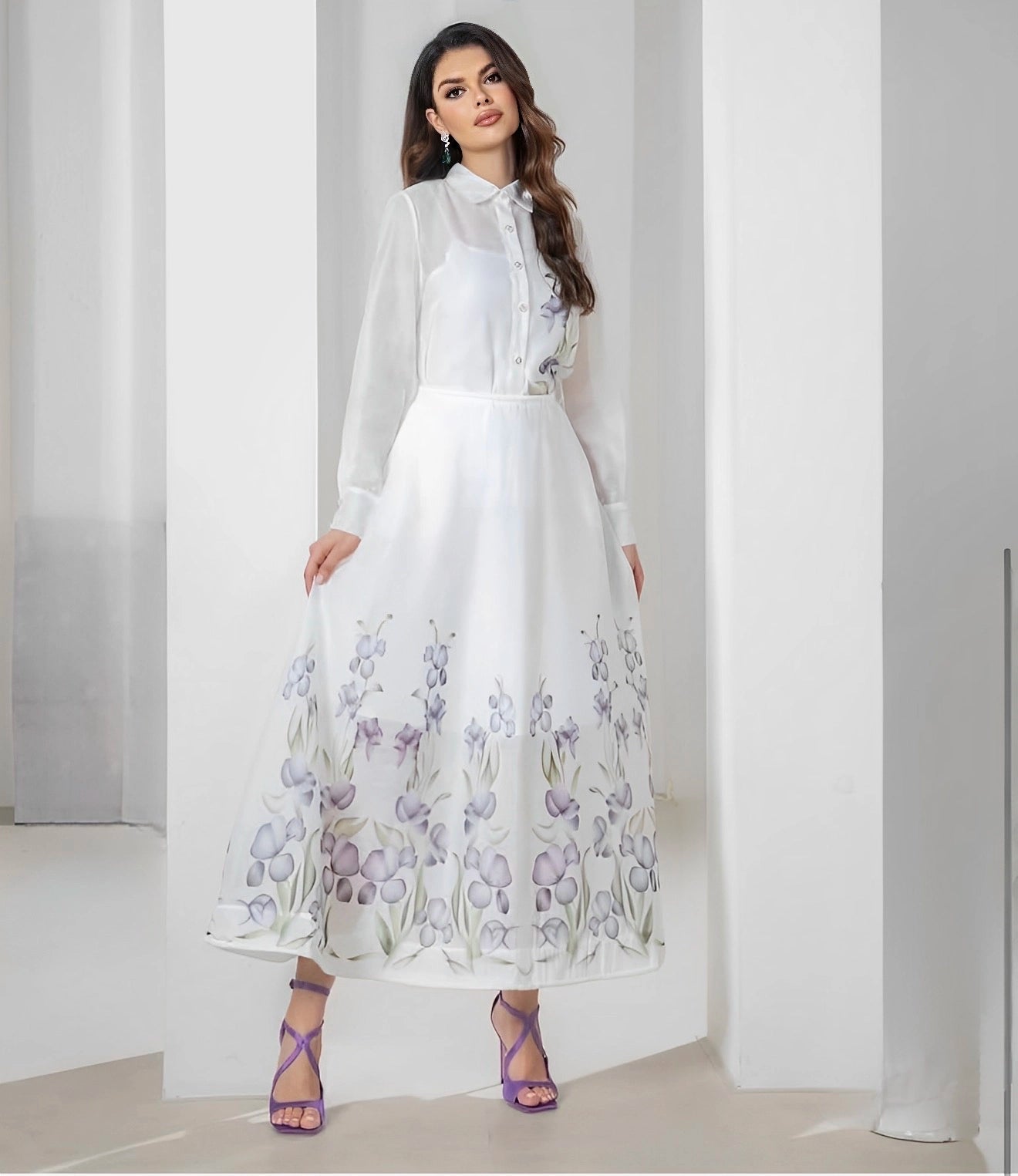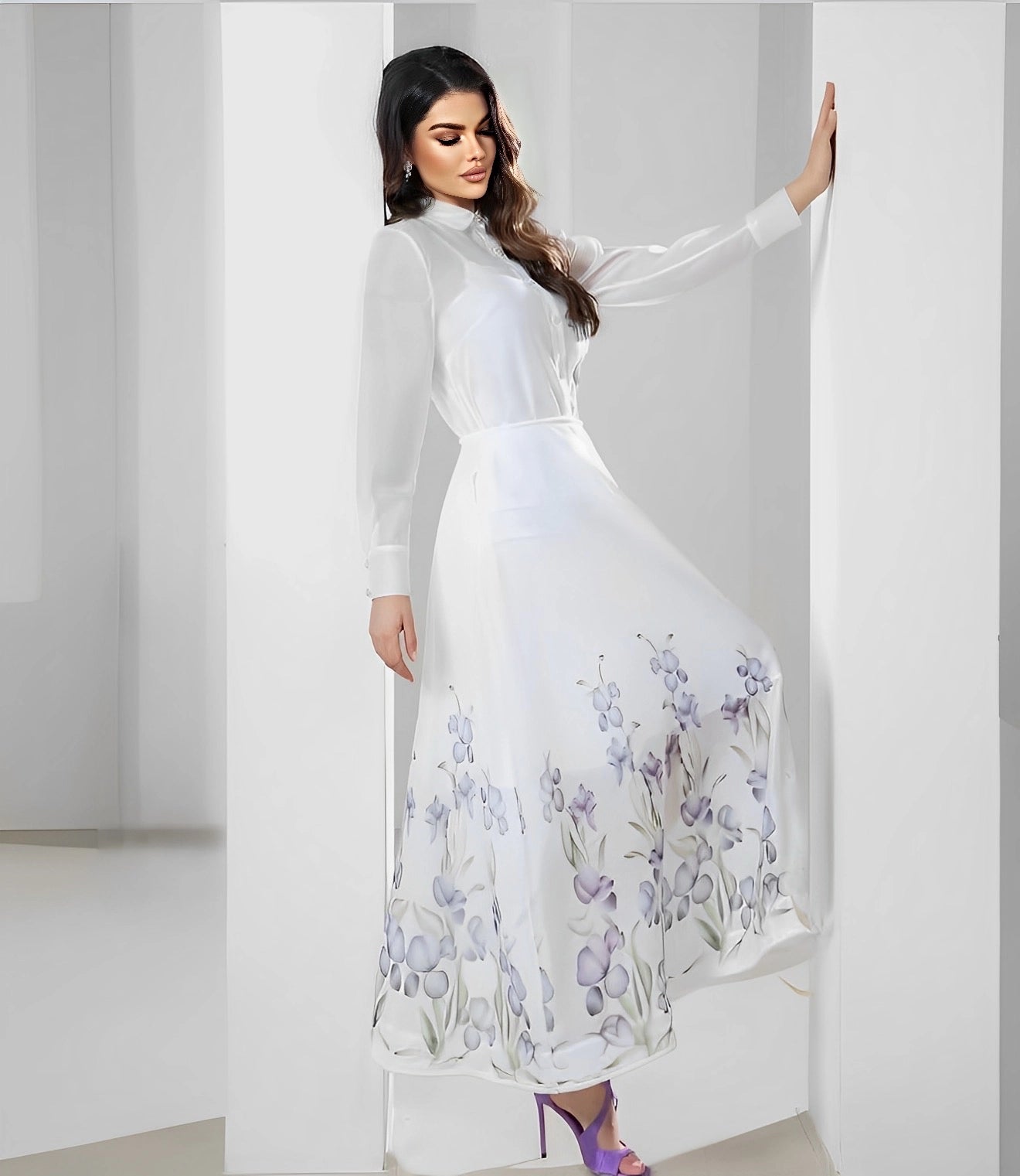 Long sleeve floral shirt with maxi skirt
