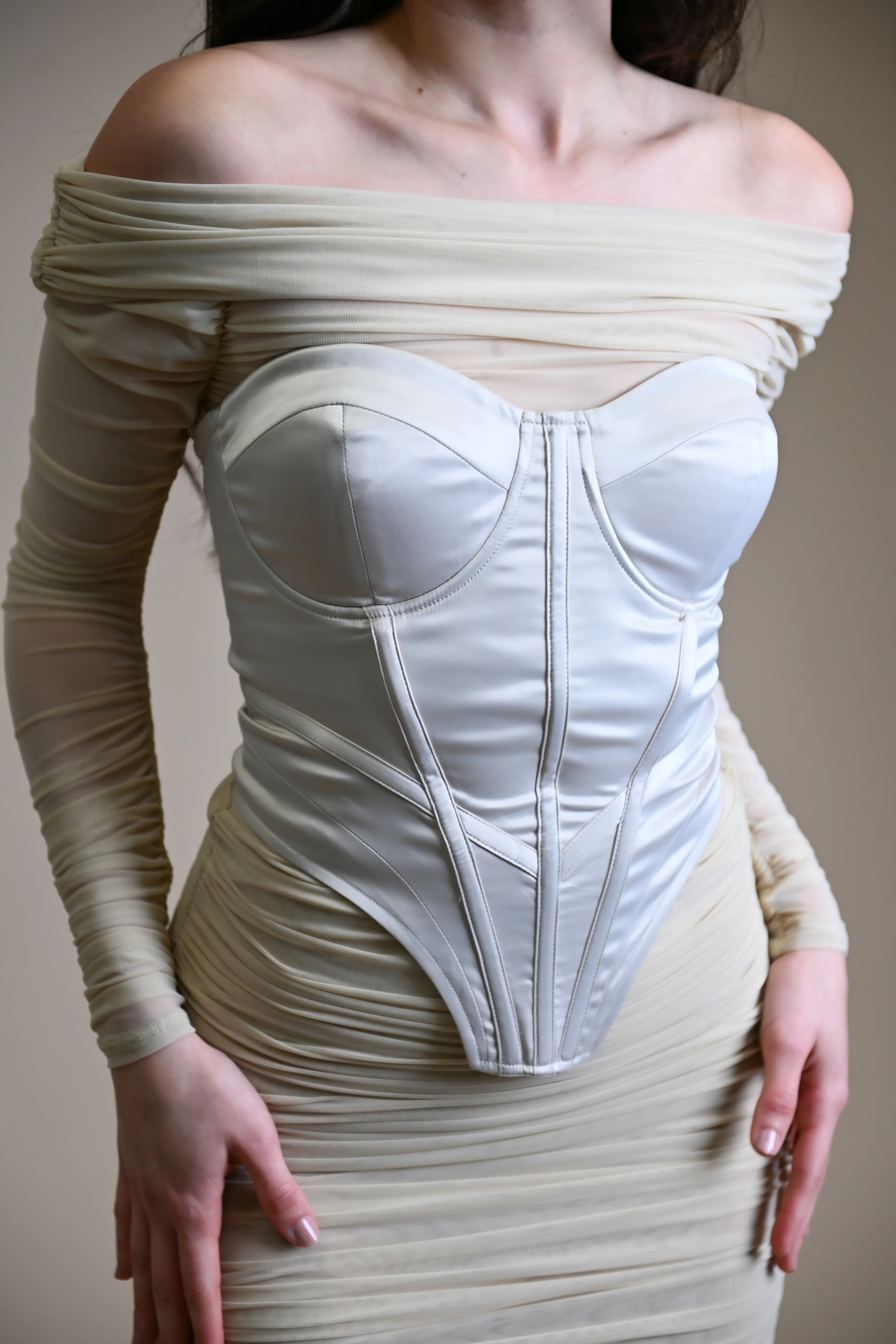The model is wearing a size S, which fits her measurements: bust 32", waist 24". She is 5'8" tall.
